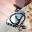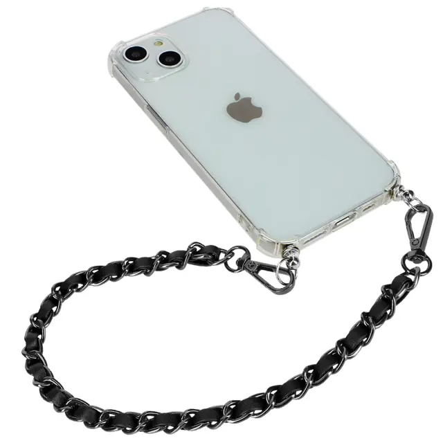 Verižica za telefon s kavljem, združljiva z vsemi etuiji za vrvice. Kombinacija črnega umetnega usnja s kovinsko verižico za eleganten videz. Z dolžino 40 cm za boljšo ergonomijo. Za večje udobje ga lahko ovijete okoli zapestja.