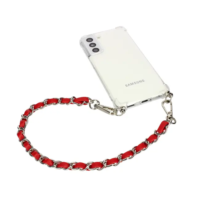 Verižica za telefon s kavljem, združljiva z vsemi etuiji za vrvice. Kombinacija rdečega umetnega usnja s kovinsko verižico za eleganten videz. Z dolžino 40 cm za boljšo ergonomijo. Za večje udobje ga lahko ovijete okoli zapestja.