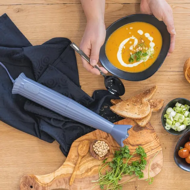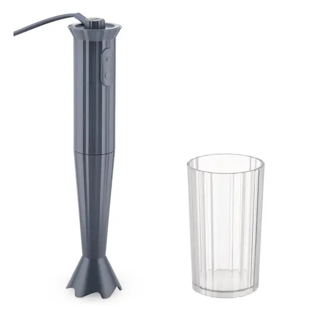 Mešalnik je izdelan iz lahke termoplastične smole, ima 700 mililitrski merilni vrč z nedrsečo podlago in je idealen za pripravo juh, otroške hrane, mlečnih napitkov in zelenjavnih pirejev. Z mešalnikom lahko mešate vročo ali hladno hrano, saj ima toplotno odpornost od -40 do +90 °C. Ima moč 500 W in možnost izbirnja dveh hitrosti: počasno in hitro mešanje. Motorno enoto očistite samo z vlažno krpo, ostale dele pa očistite pod toplo vodo in tekočino za pranje (rezila so ostra, pri čiščenju pazite).