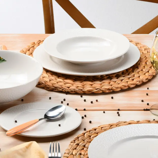 Velik, plitev krožnik Tognana Golf premera 27 cm je izdelan iz kakovostnega porcelana v barvi smetane. Ponaša se z izjemnim reliefnim detajlom, ki spominja na golf žogico. Primeren je za vsakodnevno uporabo in za serviranje jedi ob posebnih priložnosti. Lahko ga postavite v mikrovalovno pečico in pomijete v pomivalnem stroju. Naj čudoviti detajli popestrijo jedi in vašo mizo.