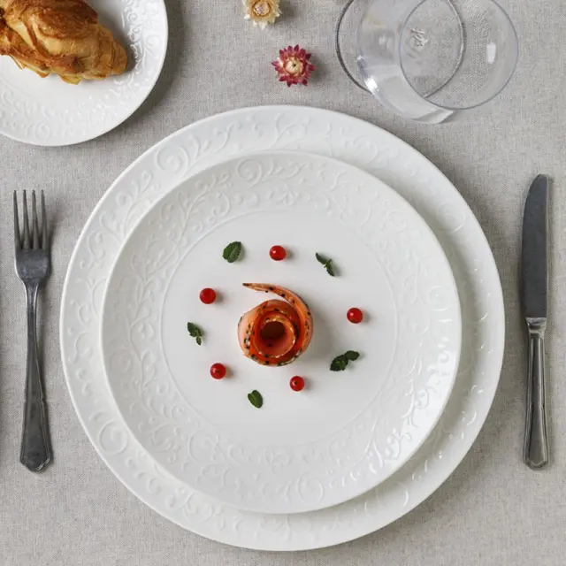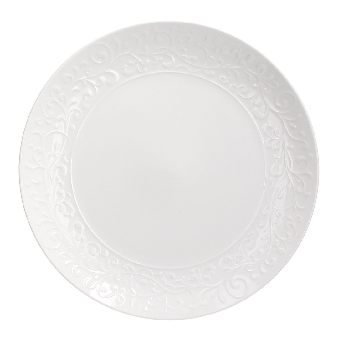 Plitev krožnik Jasmin premera 28 cm je del romantične linije, blagovne znamke Tognana, ki se ponaša s cvetličnim reliefnim ornamentom na robovih krožnika, ki spominjajo na cvetoči jasmin. Čiste linije in bela barva bosta na vašo mizo vnesla eleganco in prefinjenost. Krožnik je izdelan iz kakovostnega porcelan, ki je primeren za uporabo v mikrovalovni pečici in pomivanje v pomivalnem stroju. Kombinirajte ga še z ostalimi izdelki iz iste linije Jasmin.