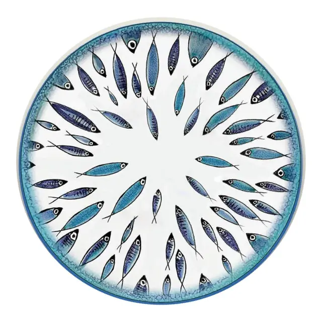 Okrogel plitev krožnik Arca Sarda (sardinska barka) je kot nalašč za poletne dni, saj na njem lahko postrežete ribe in ostale morske dobrote, ki ste jih ravno spekli na žaru. Izdelan je iz umetnega materiala melamin, ki je odporen na udarce in zato idealen za uporabo na prostem (piknik, plaža, rojstni dan …). Krožnik premera 28 cm krasi moder rob in motiv ribic. Primeren je za pomivanje v pomivalnem stroju. Dopolnite ga še z ostalimi izdelki iz iste linije Sarda.