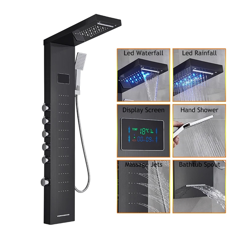 Plošča za tuširanje, LED slap, digitalni prikaz temperature, masažni curki, črna 8013