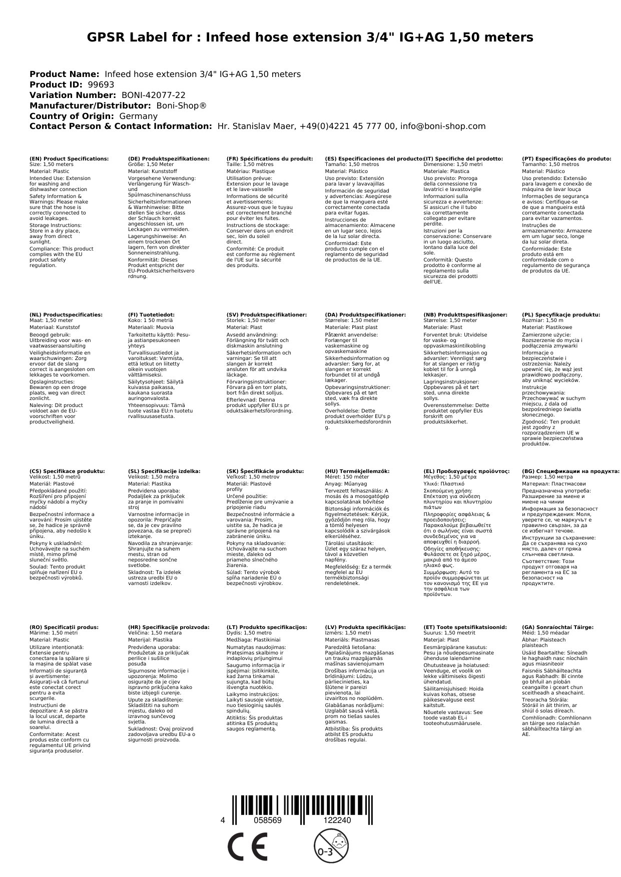 Podaljšek dovodne cevi 3/4 cola, 1,5 m z EPDM gumo in enostavno montažo