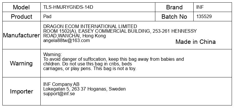 Opozorilo: Da preprečite nevarnost zadušitve, hranite to torbo stran od dojenčkov in otrok. Te vrečke ne uporabljajte v otroških posteljah, posteljnih vozičkih ali igralih. Ta torba ni igrača.