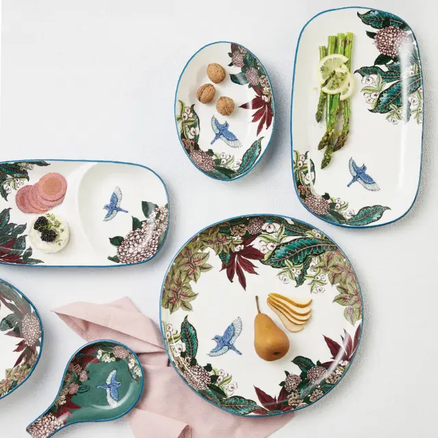 Podstavek za kuhanice Reminisce je bil zasnovana v sodelovanju z umetnico Nehe Gupte, znane kot Blck Pen iz Sydneyja. Izdelan je iz keramike v zelenem odtenku z veličastnim dizajnom bujnega cvetja hortenzij in listja v umetničinem značilnem slogu akvarela in črnila. S pomočjo podstavka boste na eleganten način zaščitili kuhinjski pult ali mizo pred kapljanjem in madeži, saj lahko na podstavek odložite kuhalnico ali žlico med kuhanjem. Z dramatično temno paleto združuje svež, sodoben slog z romantiko klasičnega cvetja – čudovita ideja za darilo. NAMIG: Dopolnite ga še z ostalimi izdelki iz iste zbirke Reminisce, ki ponuja vrsto predmetov, vključno s krožniki in skledami, ki se ponašajo s kontrastnim učinkom, ustvarjenim s temeljno surovo keramiko Stoneware v kombinaciji z glazuro visokega sijaja.