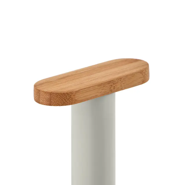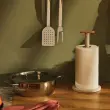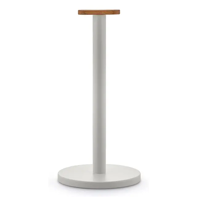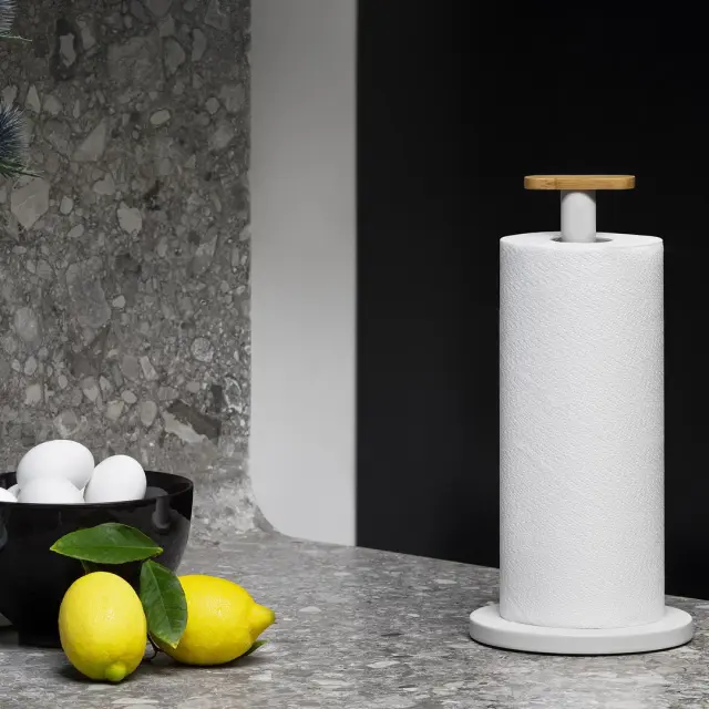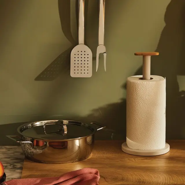 Kompaktni podstavek za kuhinjske brisače (rolo) Alessi Mattina, se ponaša z minimalističnim dizajnom, ki vključuje vrsto detajlov, namenjenih izboljšanju njegove funkcionalnosti. Za blagovno znamko Alessi ga je zasnoval oblikovalski trio Big Game. Podstavek je nepogrešljiv dodatek v kuhinji, pogosto pa se je začel pojavljati tudi na naših mizah, saj ponuja odlično alternativo papirnatim servietam, ki so pogosto manj vpojne od papirnatih brisač. Podstavek je izdelan iz jela v svetlo sivi barvi, ki ga na vrhu krasi lesen detajl iz bambusovega lesa. Ni primerno za pomivanje v pomivalnem stroju. NAMIG: Dopolnite ga še z ostalimi izdelki iz iste linije Mattina.