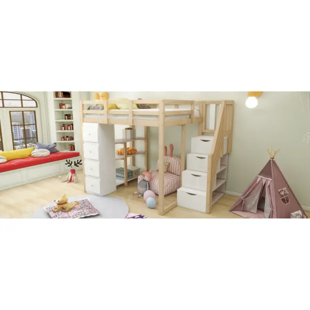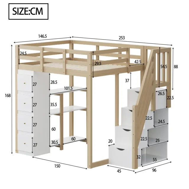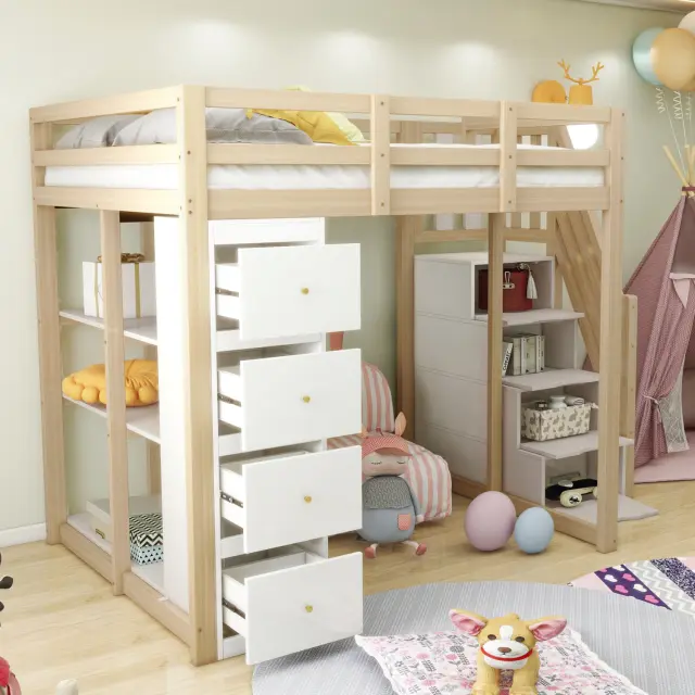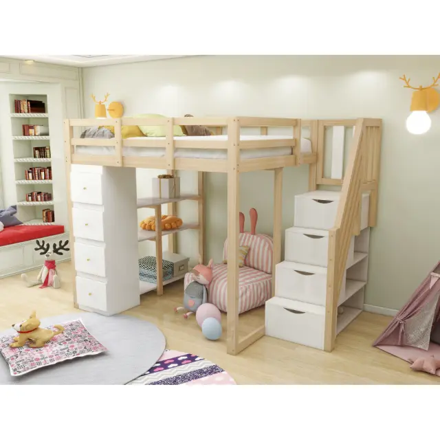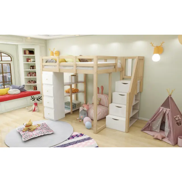 Podstrešna postelja 140x200 cm s shrambo, komodo, policami in lestvijo. LDB00278AAN