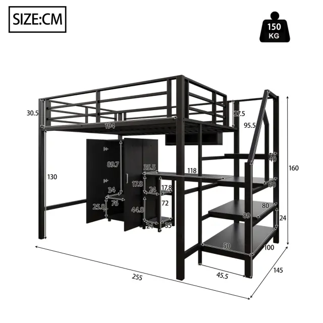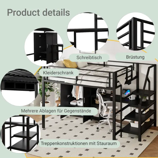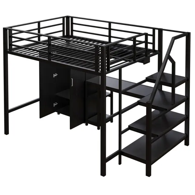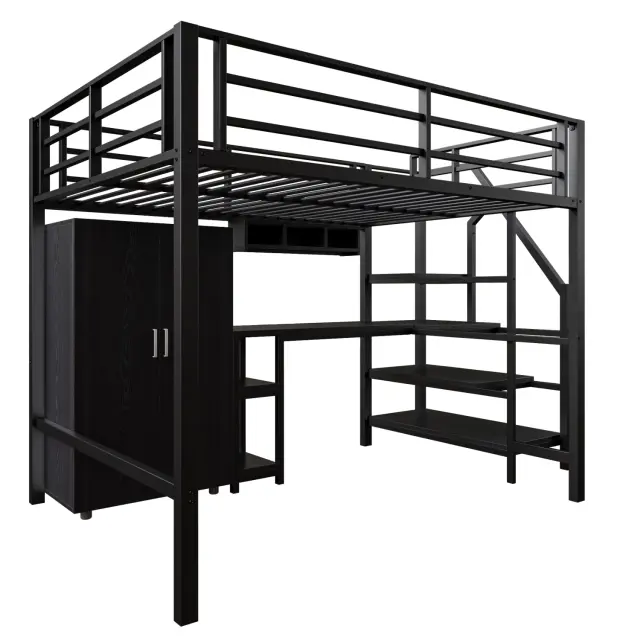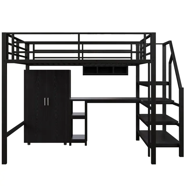 Podstrešna postelja 140x200 cm z omaro, policami, lestvijo in mizo, črna