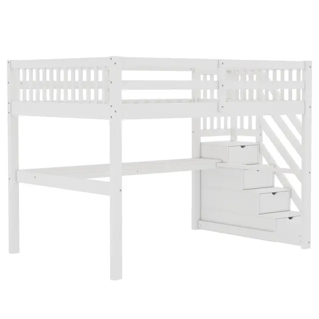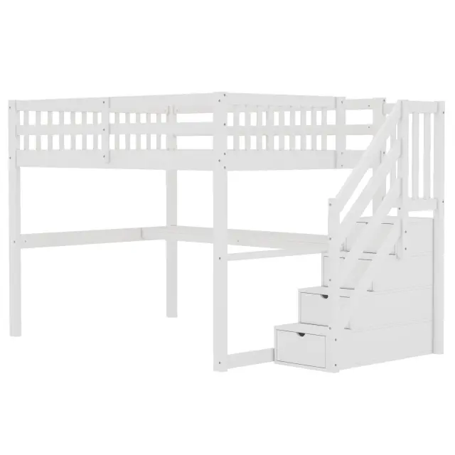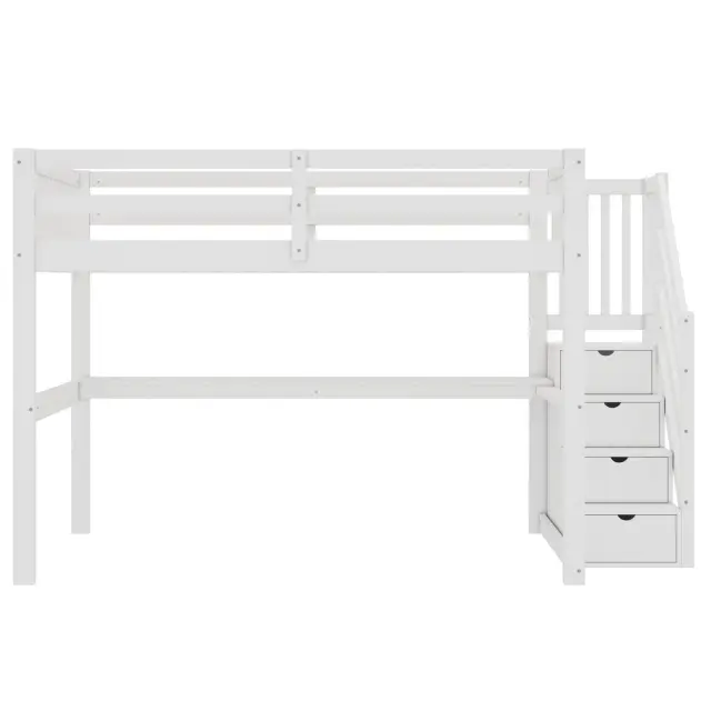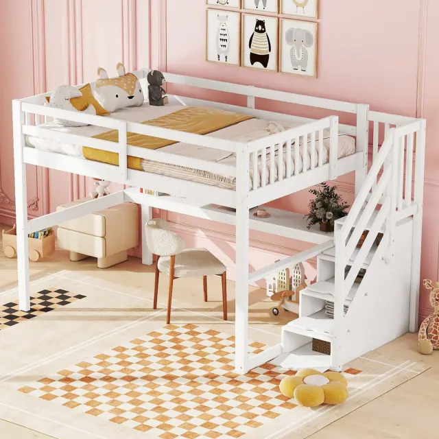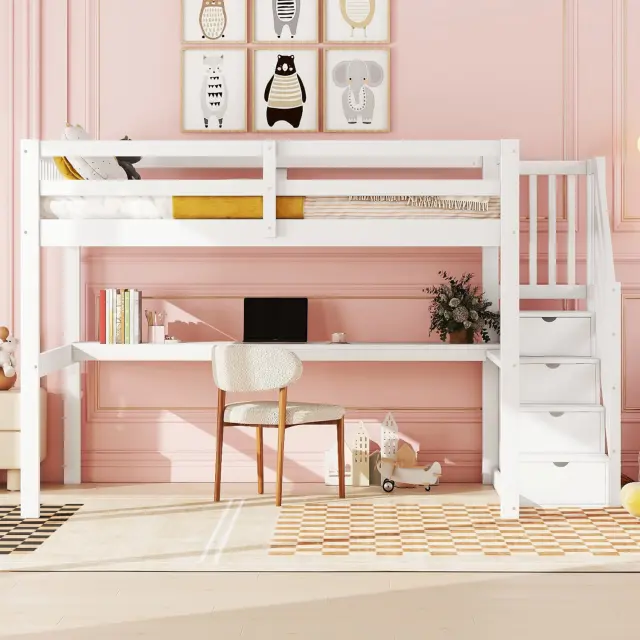 Podstrešna postelja, 140x200, otroška podstrešna postelja, s predali za shranjevanje in mizico pod posteljo, bela
