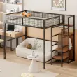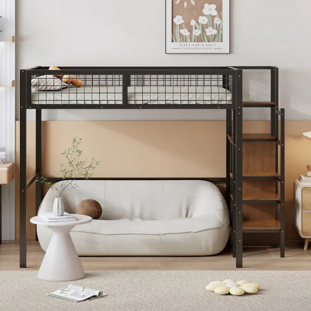 Podstrešna postelja 140x200 z lestvijo, železnim okvirjem, shrambo in omaro, črna