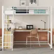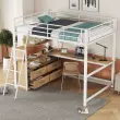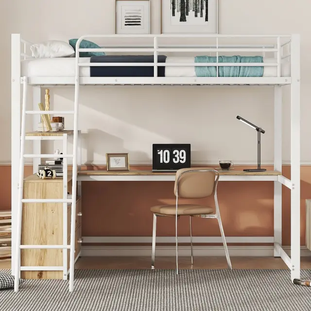 Podstrešna postelja 140x200cm, železno ogrodje, s predali, pisalna miza v obliki črke L, bela (brez vzmetnice)