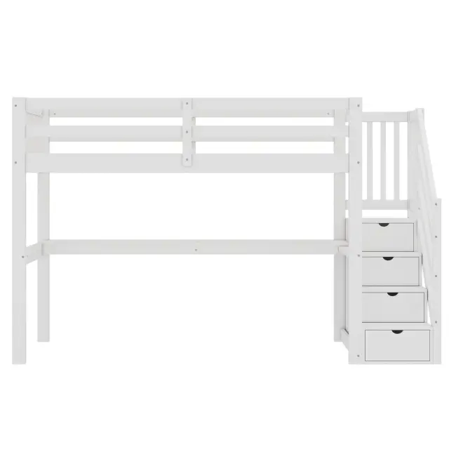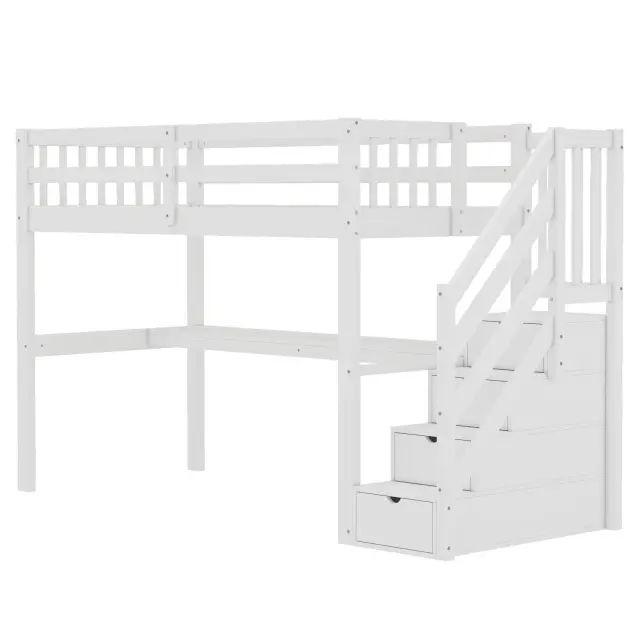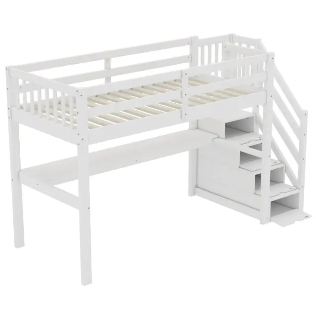 Podstrešna postelja, 90 x 200, otroška podstrešna postelja s predali za shranjevanje in mizico pod posteljo, bela