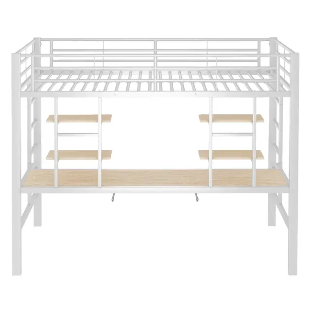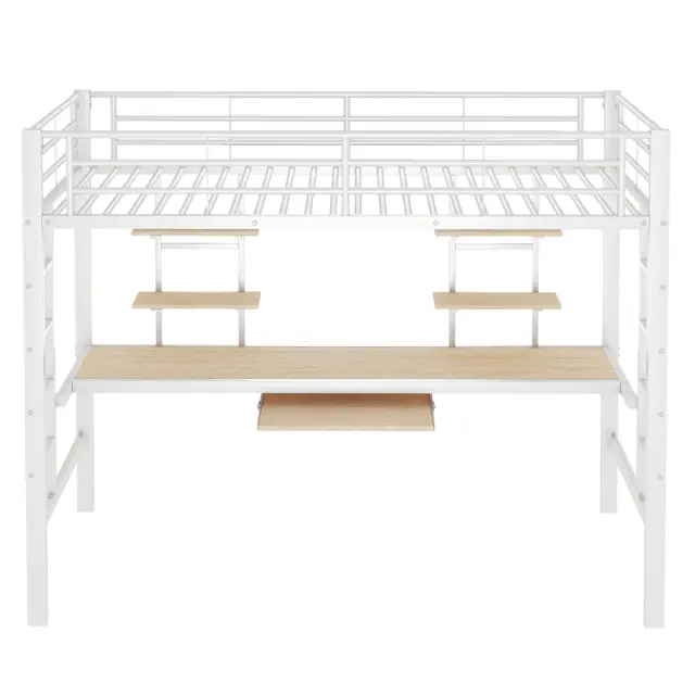 Podstrešna postelja 90x200 cm kovinska z mizo in policami, bela