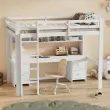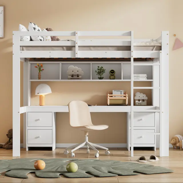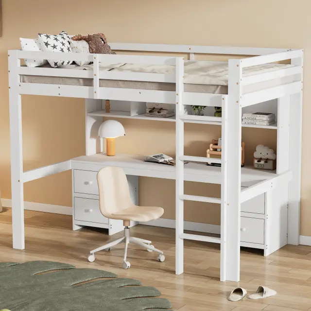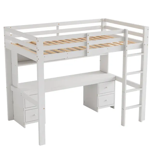 Podstrešna postelja 90x200 cm: Otroška postelja s spodnjo mizo, veliko prostora za shranjevanje, visoko ograjo in stabilno lestvijo. Bela.