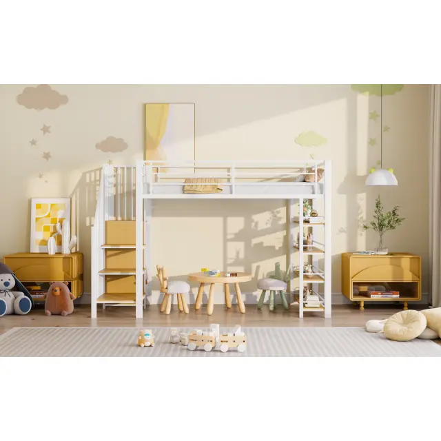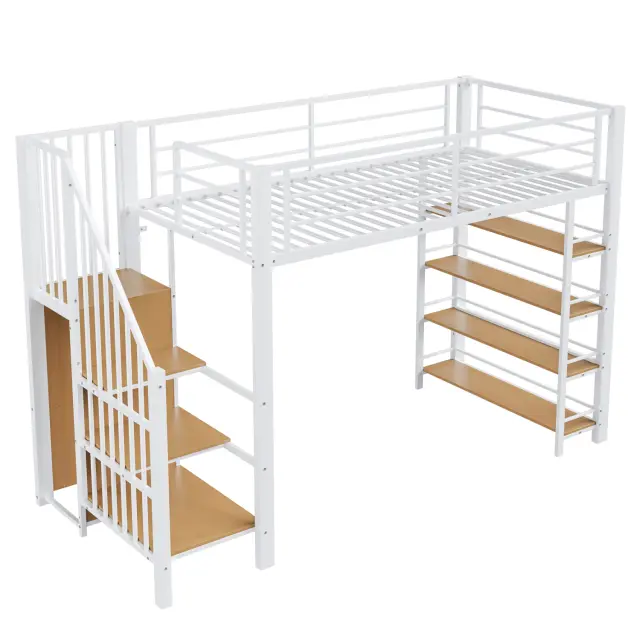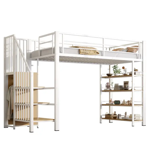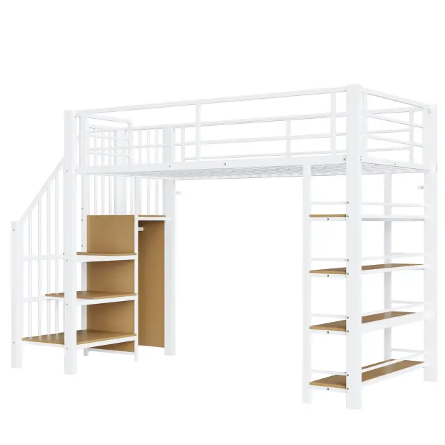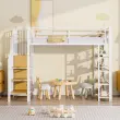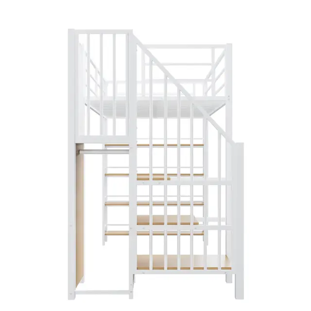 Podstrešna postelja 90x200 cm s prostorom za shranjevanje, omaro in dizajnom ograje, bela