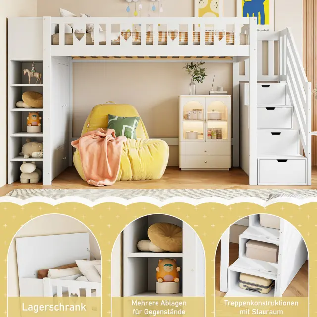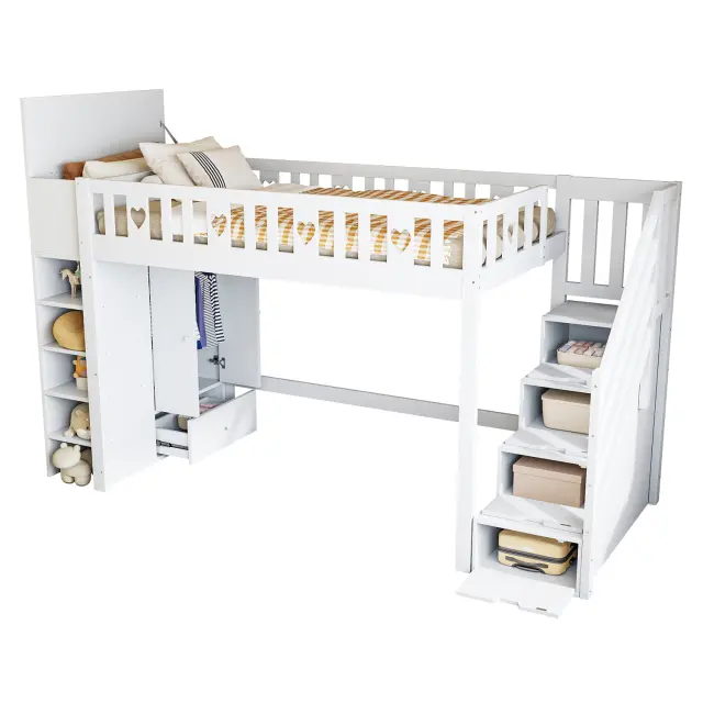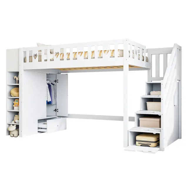 Podstrešna postelja 90x200 cm s prostorom za shranjevanje, policami in omaro, bela