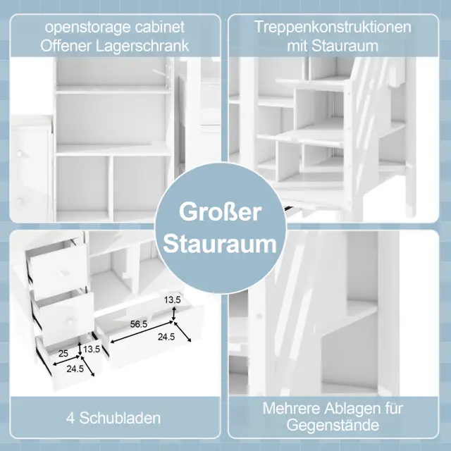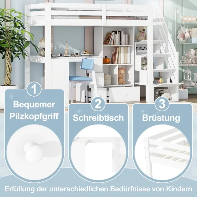 Podstrešna postelja 90x200 cm z mizo, predali in omarico za shranjevanje, bela, certificirana po EN 747