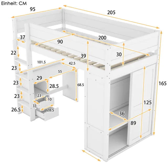 Ta podstrešna postelja dimenzij 90 x 200 cm je izdelana iz masivnega bora in MDF-ja in ponuja veliko prostora za shranjevanje, saj ima mizo, omaro in dva predala. Njena robustna konstrukcija zagotavlja stabilnost in vzdržljivost.