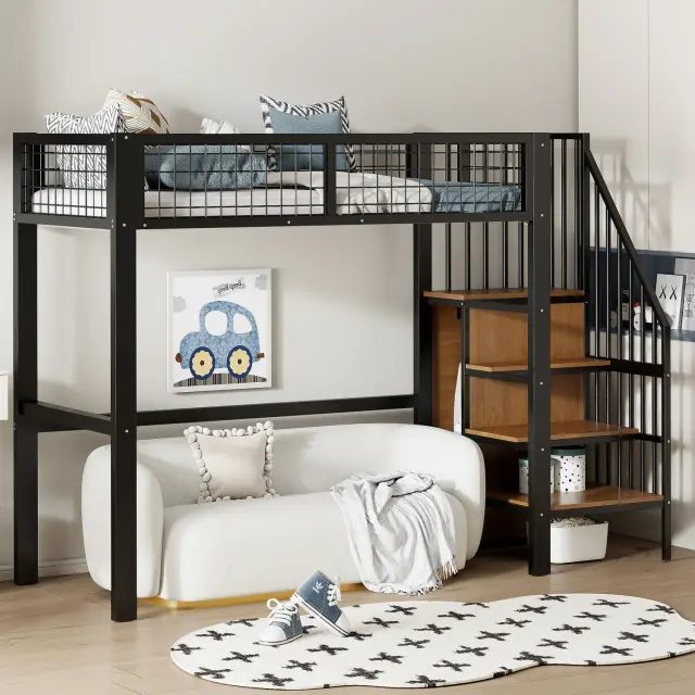 Podstrešna postelja 90x200 z lestvijo, železnim okvirjem, shrambo in omaro (črna)