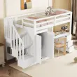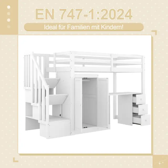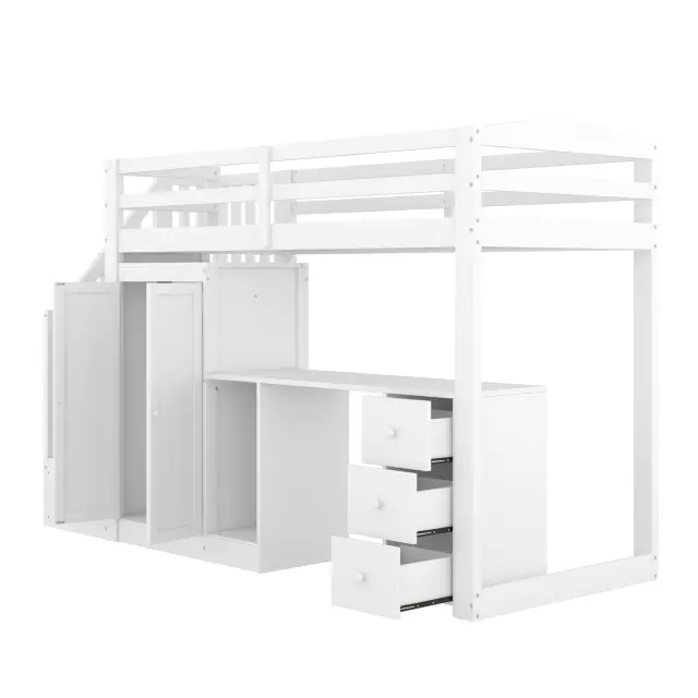 Podstrešna postelja z omaro, stopnicami, pisalno mizo in predali, 90x200 cm, bela