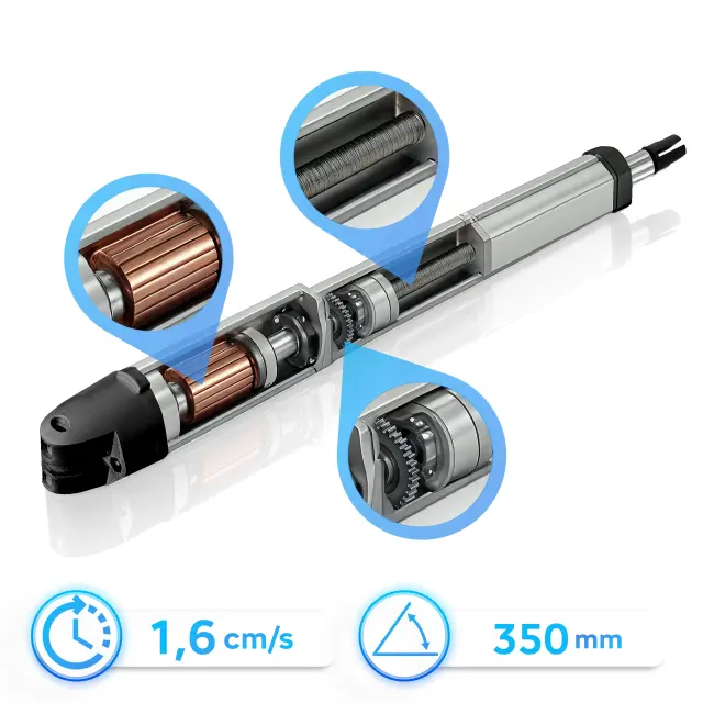 Tehnične lastnosti pogona: 24 V DC, 50 W, krilo do 2 m / 200 kg, kot odpiranja do 110°, hod 300 mm, hitrost 16 mm/s. Kovinska menjalna skrinja iz utrjenih zlitin, ohišje s prašnim premazom, zasilno odklepanje s ključem.
