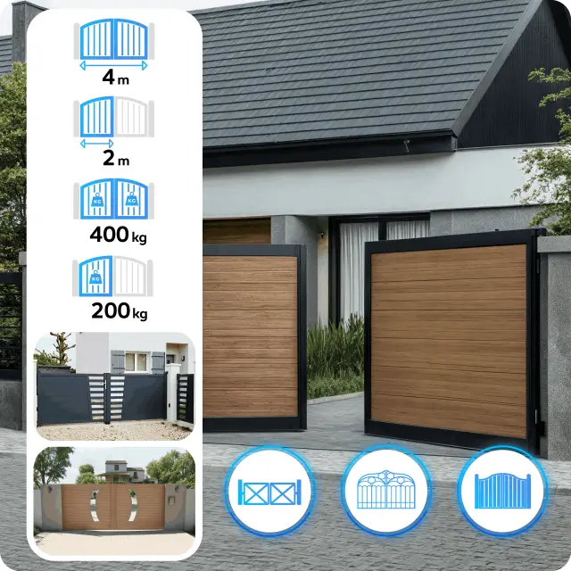Kompletni komplet za avtomatizacijo dvokrilnih vrat s krili do 2 m in skupno težo do 400 kg. Pogoni delujejo gladko in tiho, sončna energija pa omogoča delovanje tudi brez priključitve na 230 V omrežje. Fotonapetostni panel polni baterijo, zmanjšuje porabo energije iz omrežja in zagotavlja delovanje tudi med izpadom električne energije – vrata se lahko odprejo iz baterije.