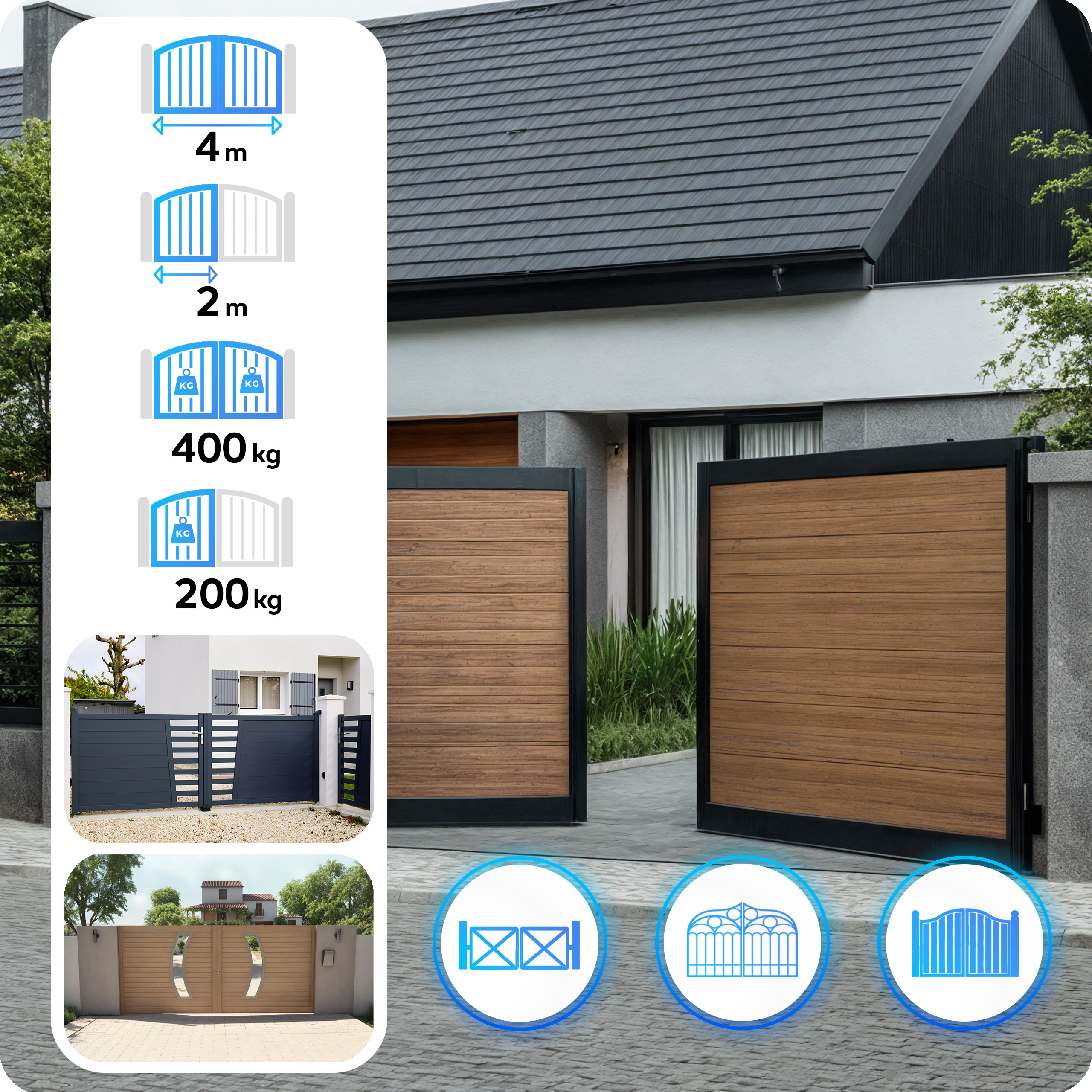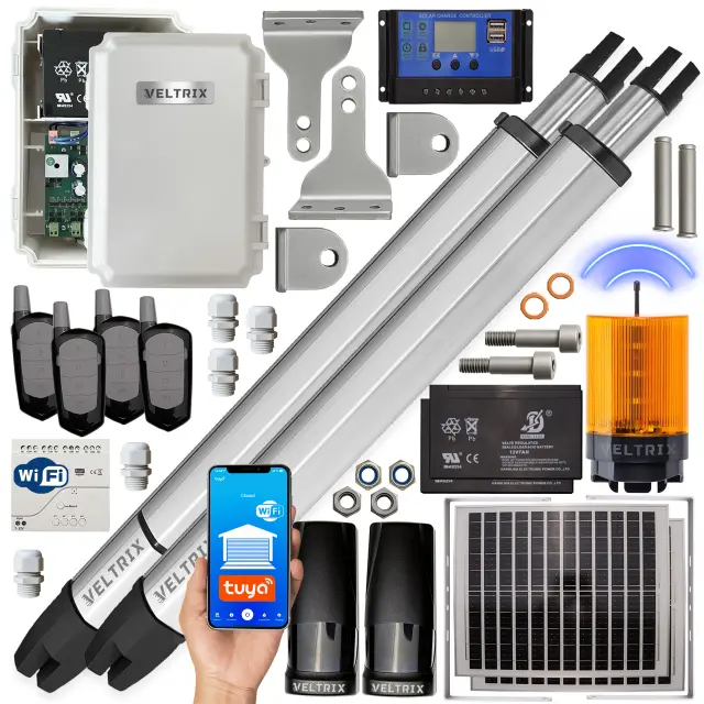 Univerzalni komplet za avtomatizacijo krilnih vrat v gospodinjstvu in lahki industriji. Pogoni podpirajo krila do 2 m in 200 kg (skupaj 4 m / 400 kg). Komplet vključuje solarni komplet (paneli + baterije) in WiFi modul, zaradi česar lahko pogon deluje tudi brez 230 V napajanja, kar zagotavlja varčevanje z energijo in delovanje v primeru izpada električne energije (zasilno odpiranje iz baterije).