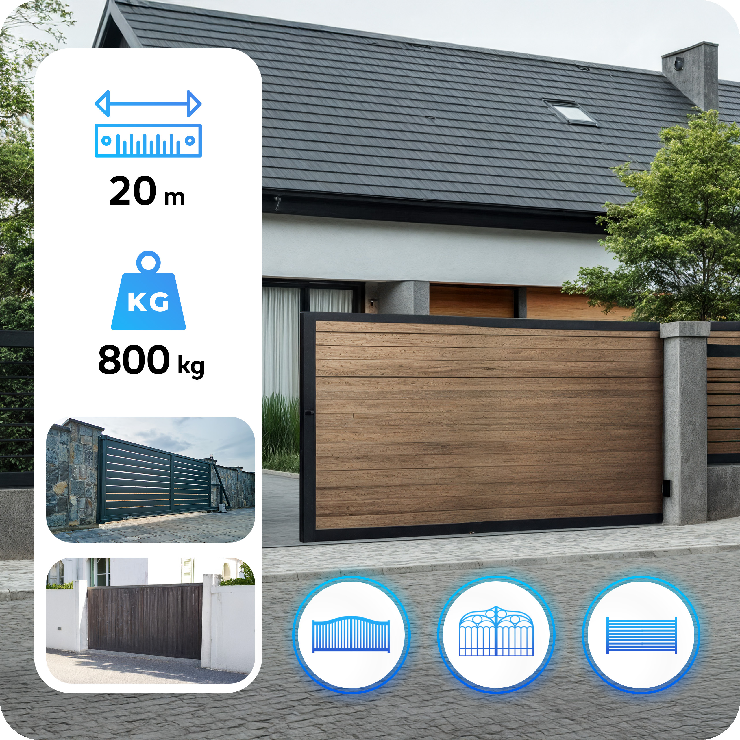 Univerzalni komplet za drsna vrata za domačo in lažjo industrijsko uporabo. Podpira vrata z maso do 800 kg in dolžino do približno 20 m. Zagotavlja nemoteno, tiho delovanje in udobje uporabe ne glede na vremenske razmere.