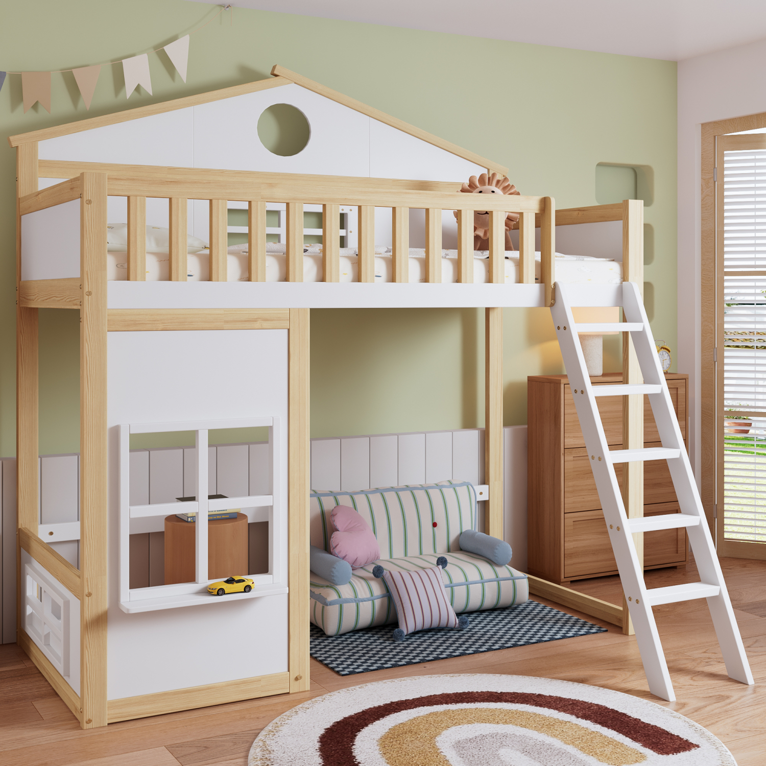 Ta pogradna postelja, izdelana iz belega in naravnega lesa, ima igrivo streho in okno, varno zgornjo posteljo z ograjo in praktično stopnišče. Prostor pod njo se lahko uporablja za shranjevanje ali igro.