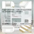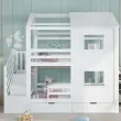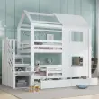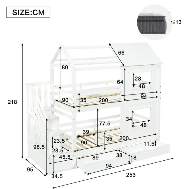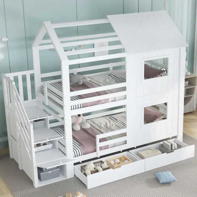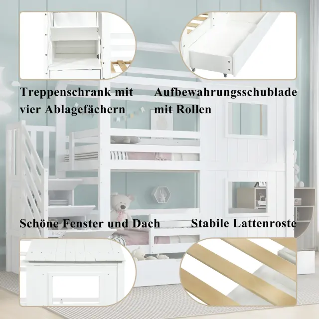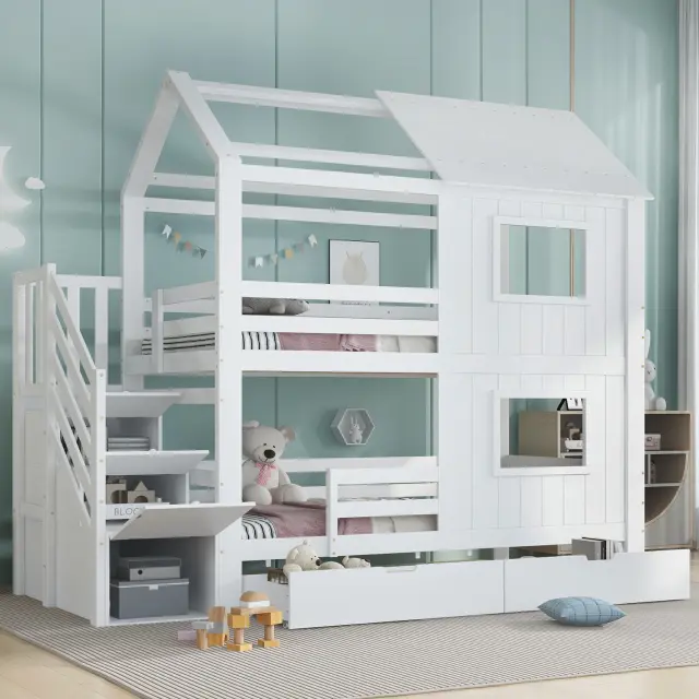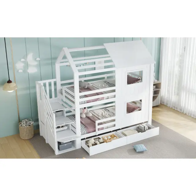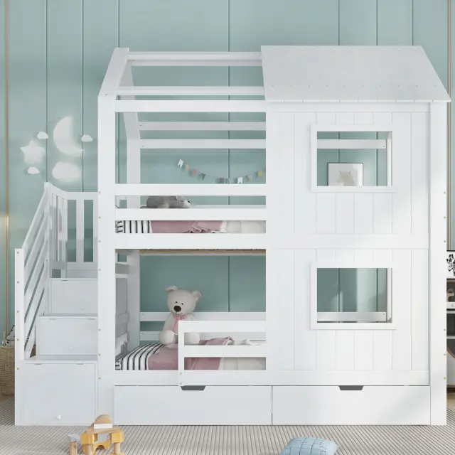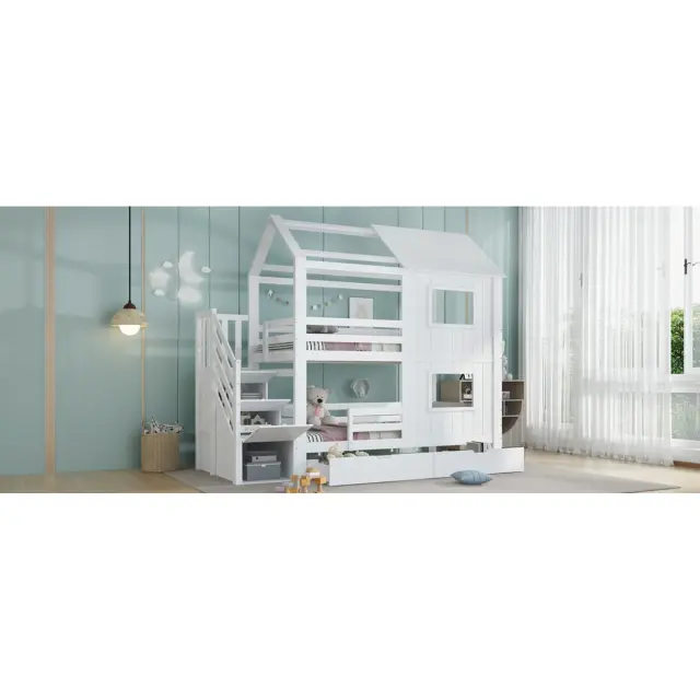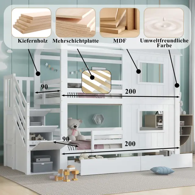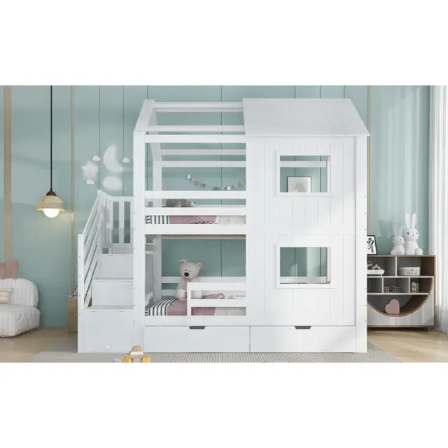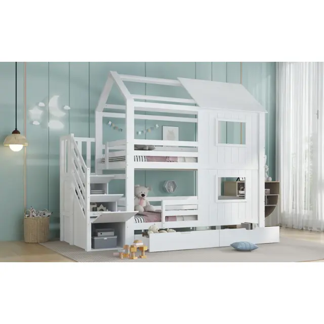 Ta pogradna postelja iz belega bora in MDF-ja ima stopnišče s policami, izvlečni predal in očarljivo zasnovo okna/strehe. Idealna je za otroške sobe, saj ponuja veliko prostora za shranjevanje in prijeten spalni prostor.