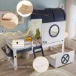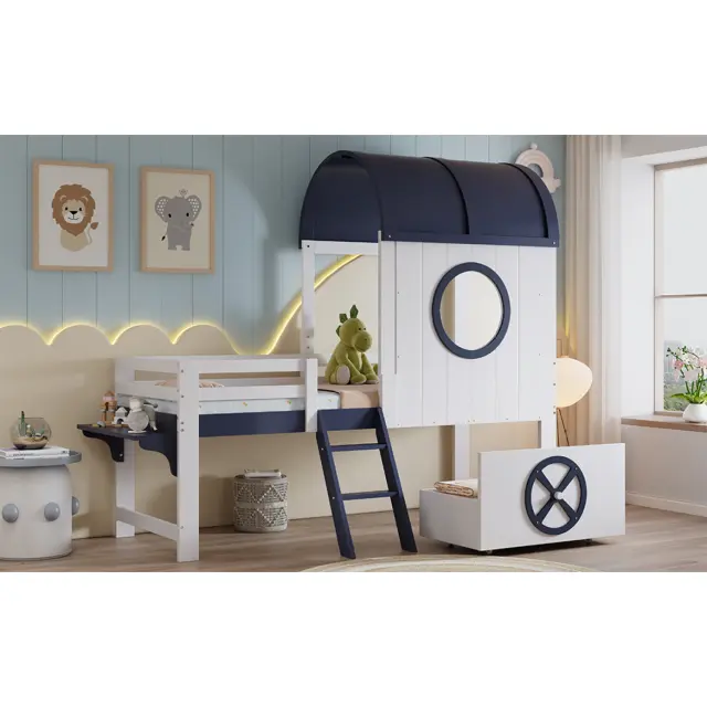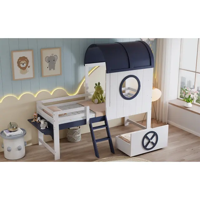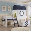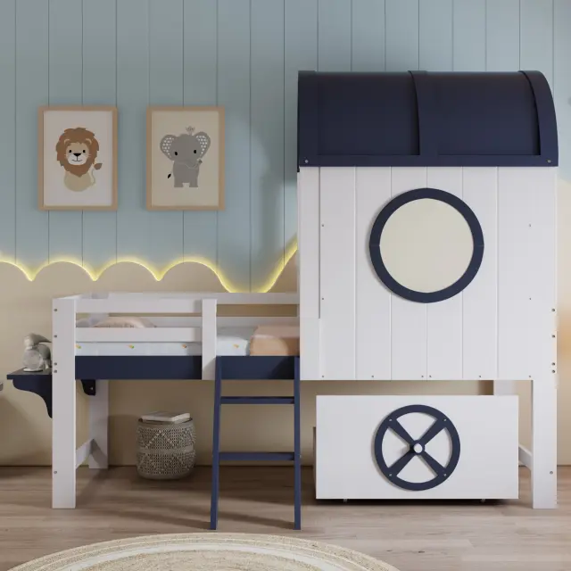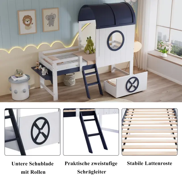 Pograd s streho in oknom, bor/MDF, bela/temno modra, 90x200 cm