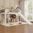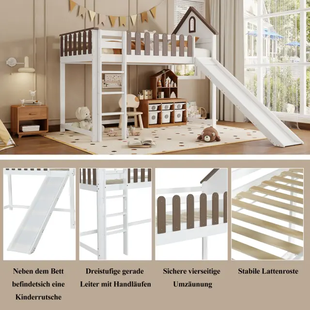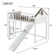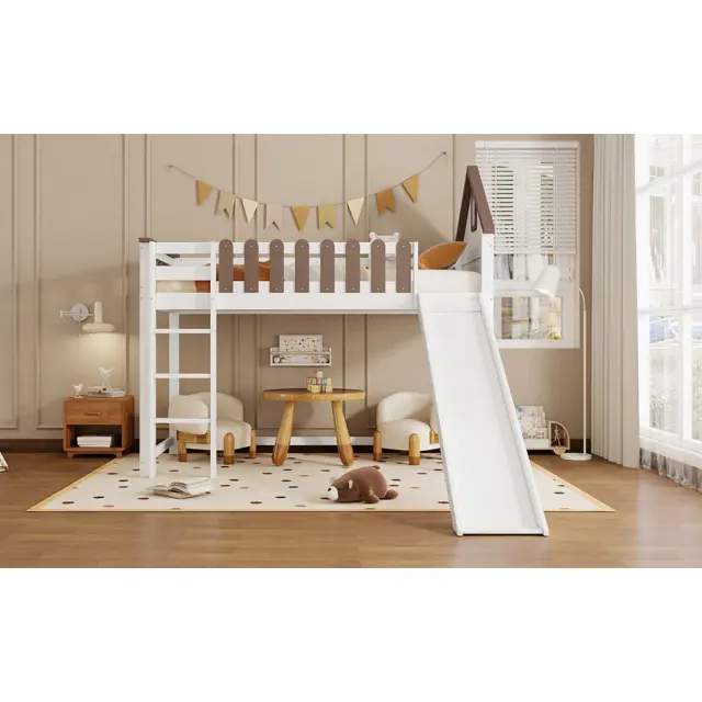Pograd s streho, oknom, toboganom, lestvijo, bor/MDF, bela/oreh, 90x200 cm