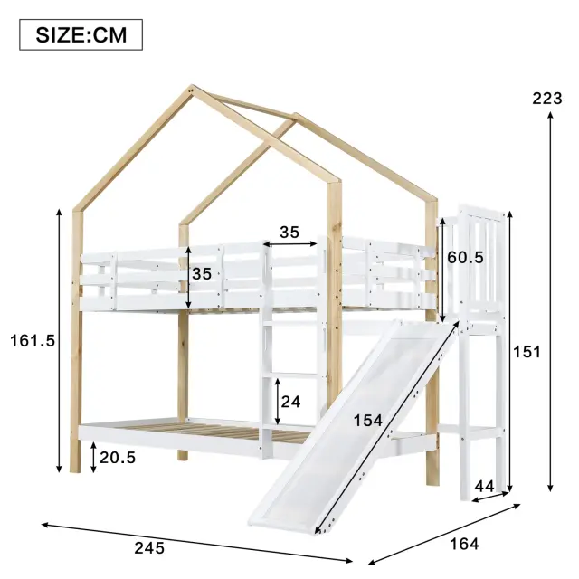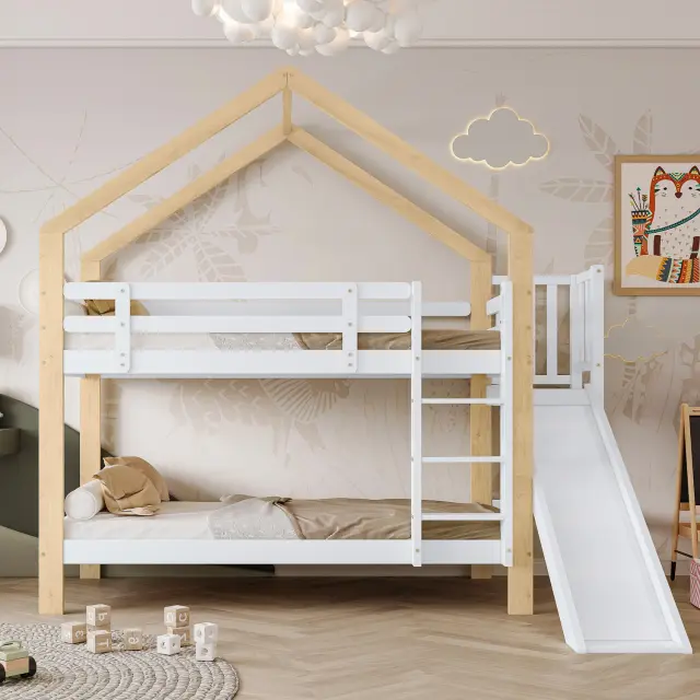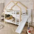 Pograd s toboganom, poševna plezalna stena, hišna postelja, varnostna ograja, otroška postelja, masiven les, bela + naravna, 90x200 cm