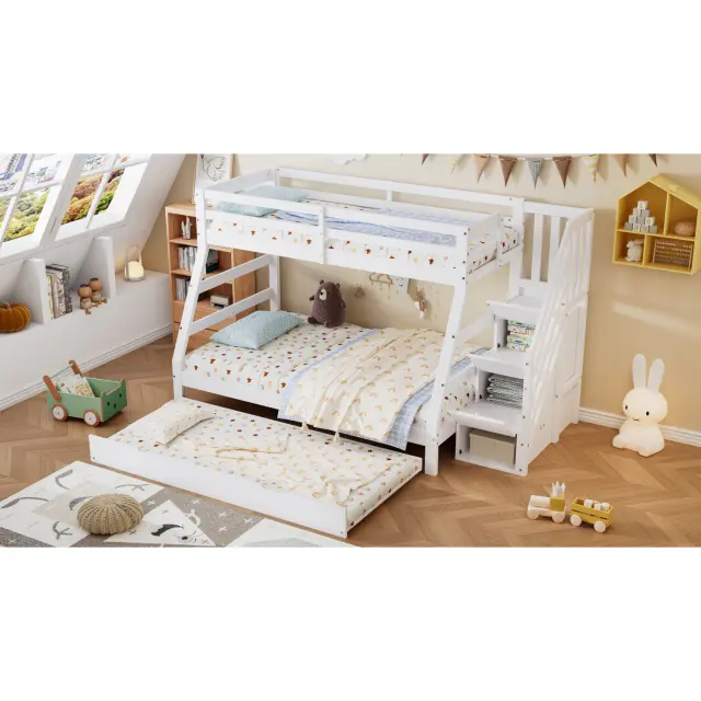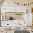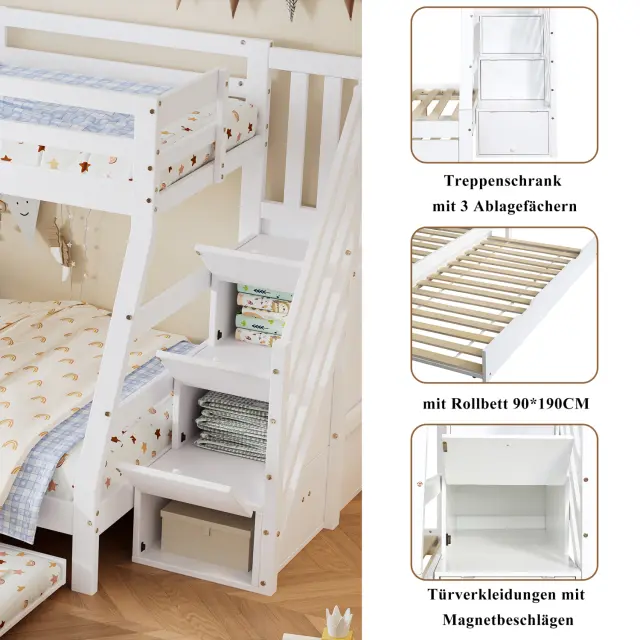 Pograd z izvlečnim ležiščem, otroška postelja z lestveno omaro, bor + MDF, bela, 90x190/90x200cm