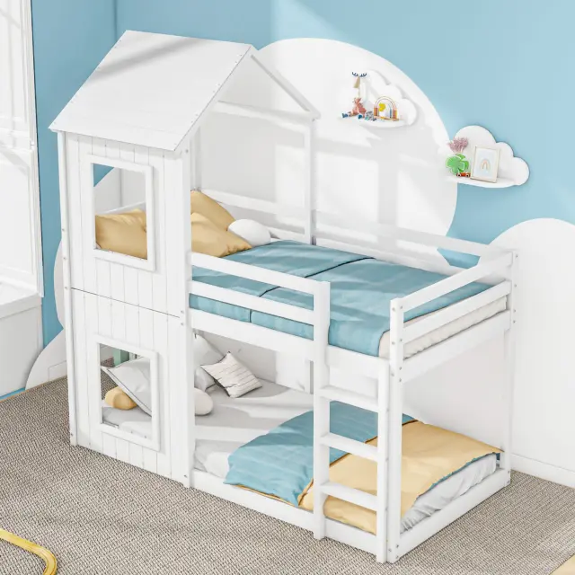 Ta lesena pogradna postelja v obliki hišice na drevesu otrokom ponuja zabavno, varno in pustolovsko spalno izkušnjo ter je izdelana iz trdnega borovega lesa z okolju prijazno barvo.