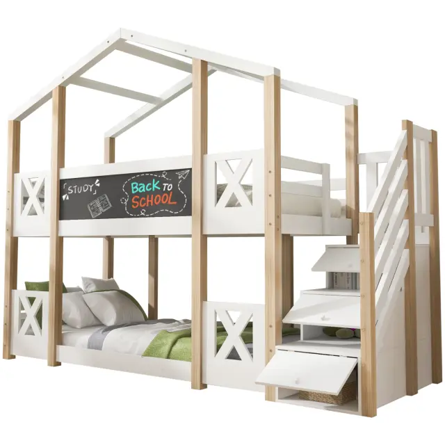 Pogradna postelja 90x200 cm s prostorom za shranjevanje, stopnicami in zaščito pred padcem.