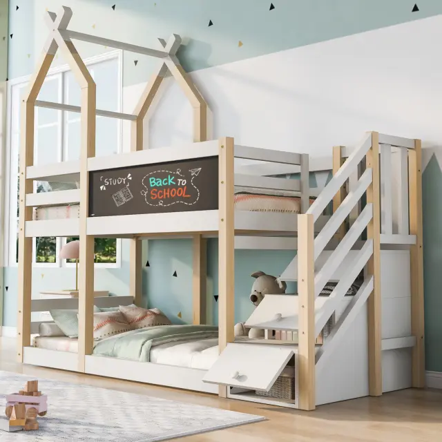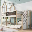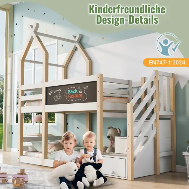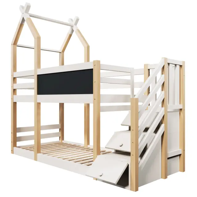 Pogradna postelja 90x200, dizajn hišice na drevesu s tablo, prostorom za shranjevanje in zaščito pred padcem, postelja v podstrešju – bela/narav