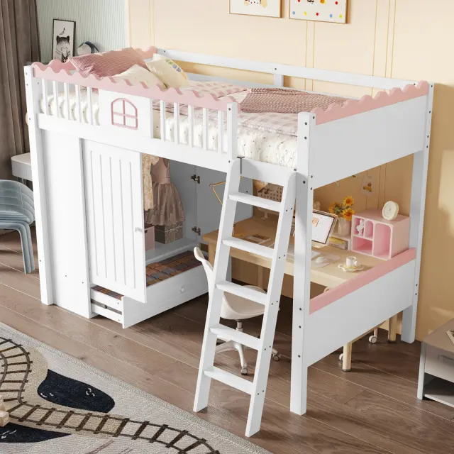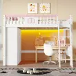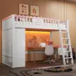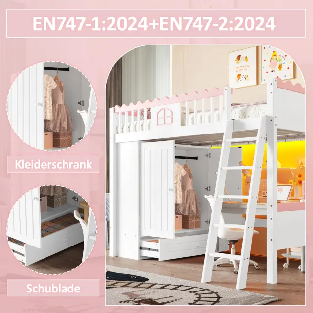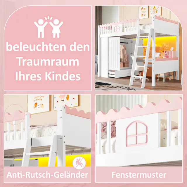 Pogradna postelja iz borovega lesa, bela, 90x200 cm, z LED osvetlitvijo, omaro in predalom.