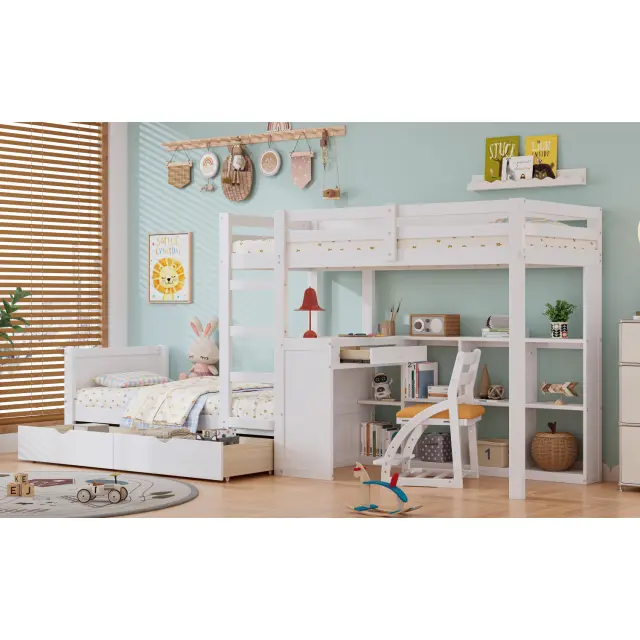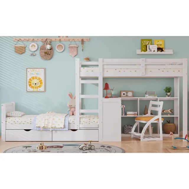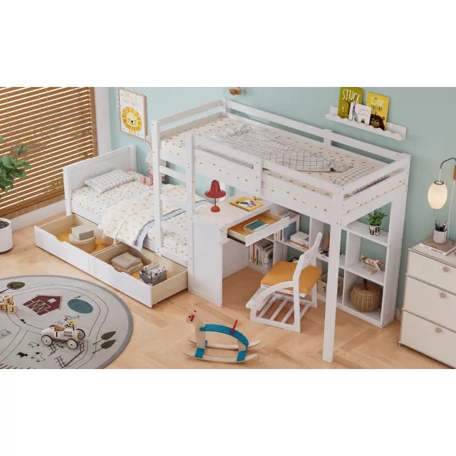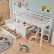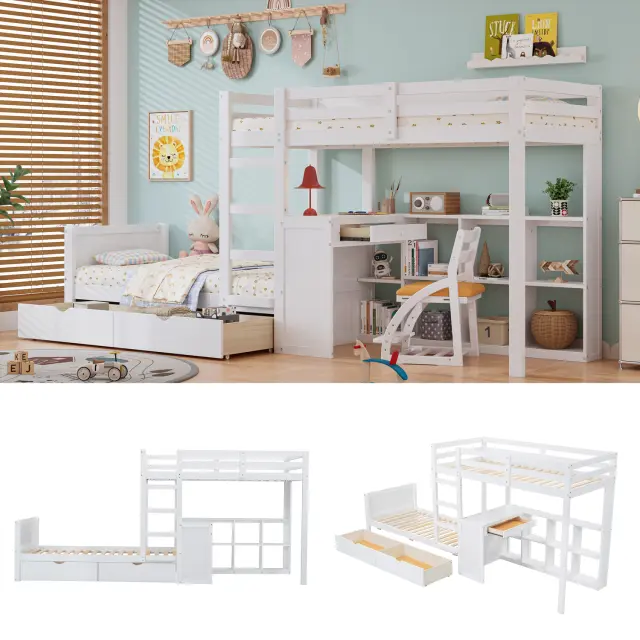 Pogradna postelja iz borovega lesa z mizo, 2 predaloma, bela, 90x200 cm