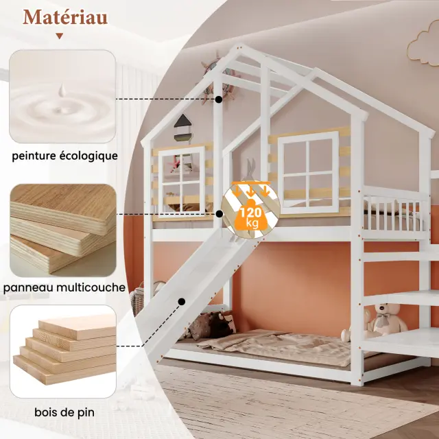 Pogradna postelja iz masivnega lesa z drsnikom in oknom, bela (90x200 cm)