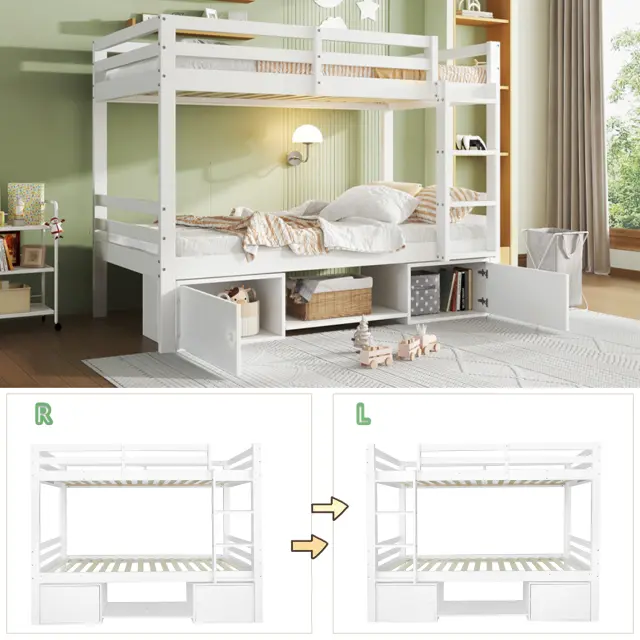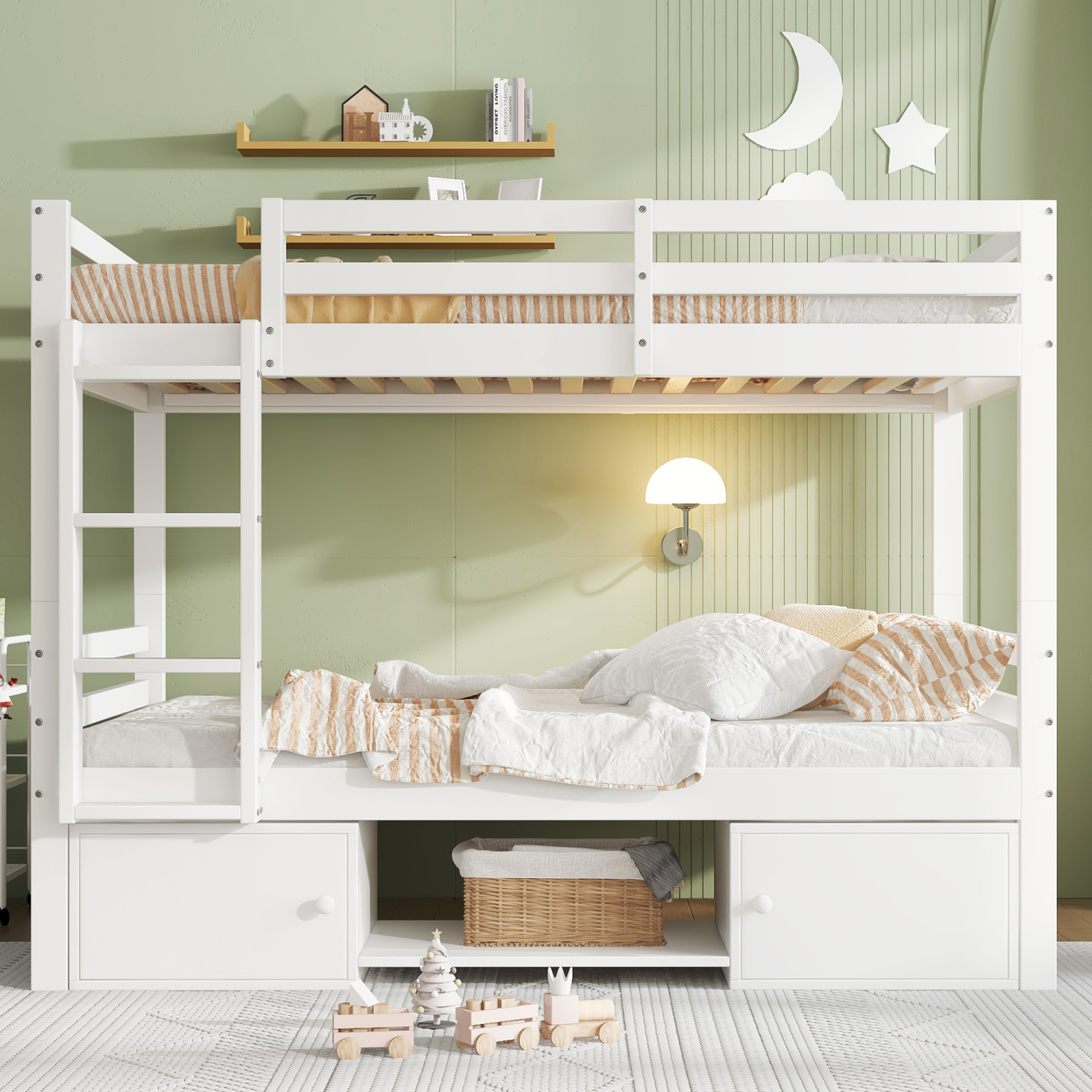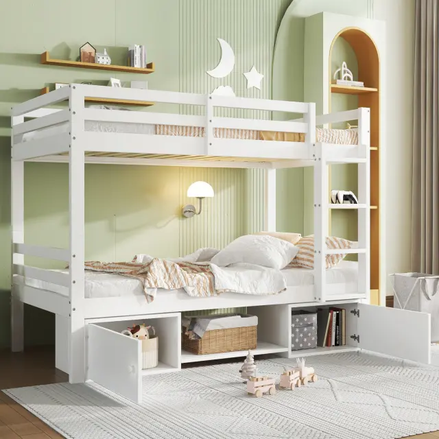 Pogradna postelja s policami za čevlje in omaricami, bela, 90x200 cm