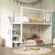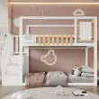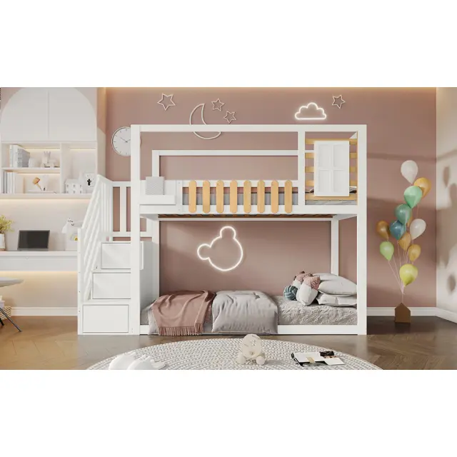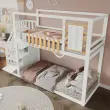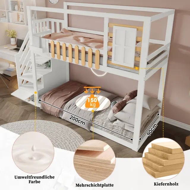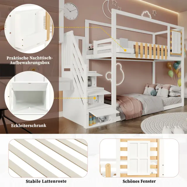 Pogradna postelja s stopnicami, oknom, shrambo, borov les, bela, 90x200 cm