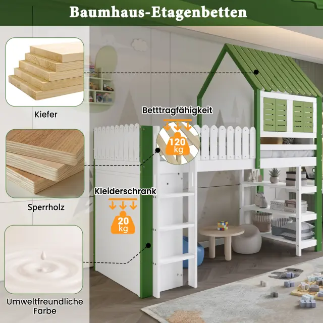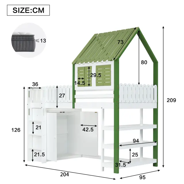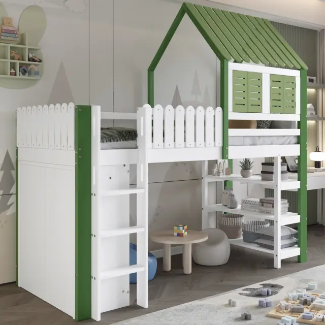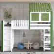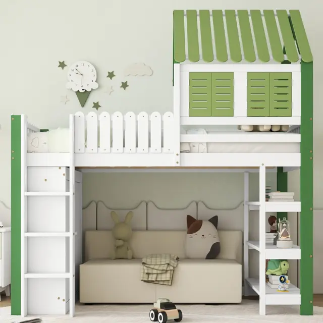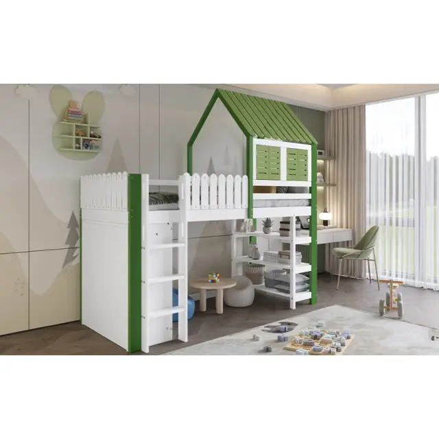 Pogradna postelja s streho, oknom, prostorom za shranjevanje, lestvijo in toboganom (90x200)