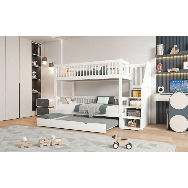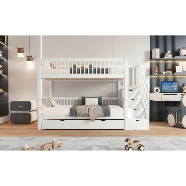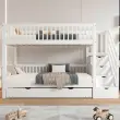 Ta bela pogradna postelja iz borovega lesa in MDF-ja (90x200/190 cm) ponuja varnost in prostor za shranjevanje z zložljivo posteljo, omarico z lestvijo in ograjo.