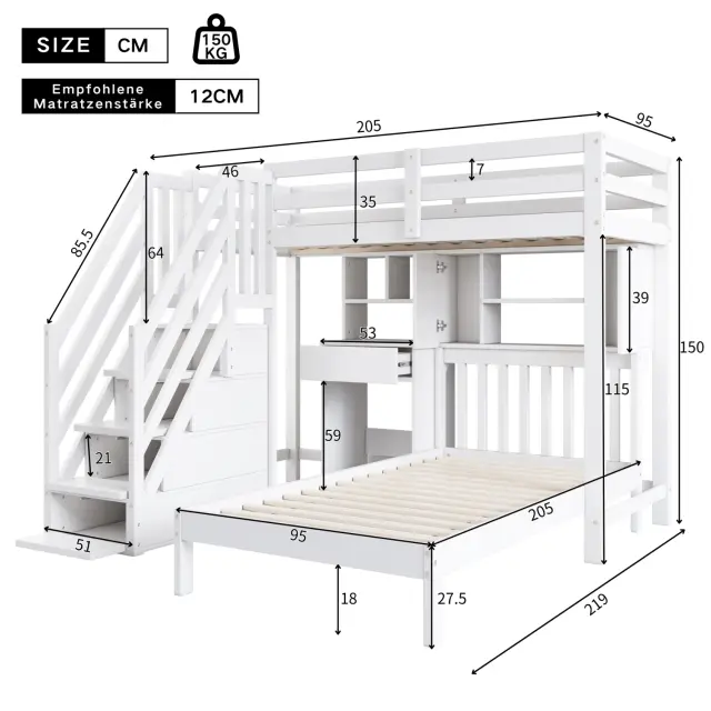 Pogradna postelja z mizo in policami, bela, 90x200 cm