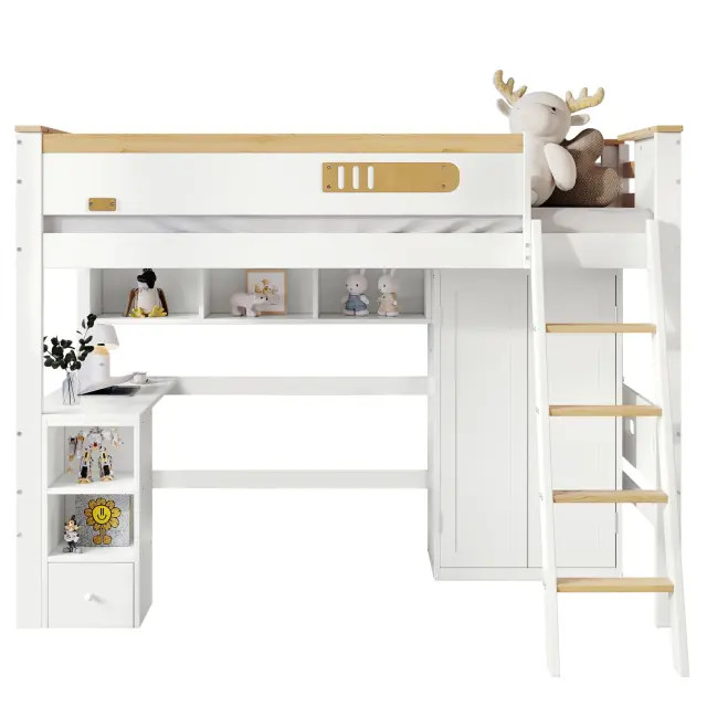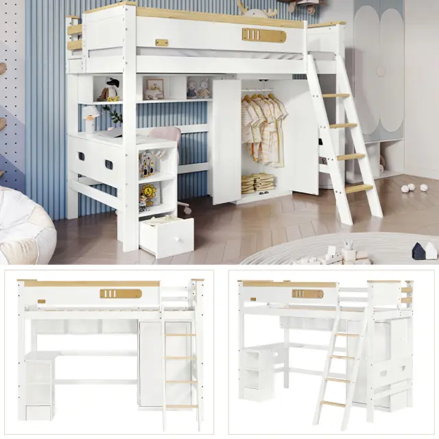 Pogradna postelja z mizo, omaro in prostorom za shranjevanje, bor/MDF, bela/naravna, 90x200 cm
