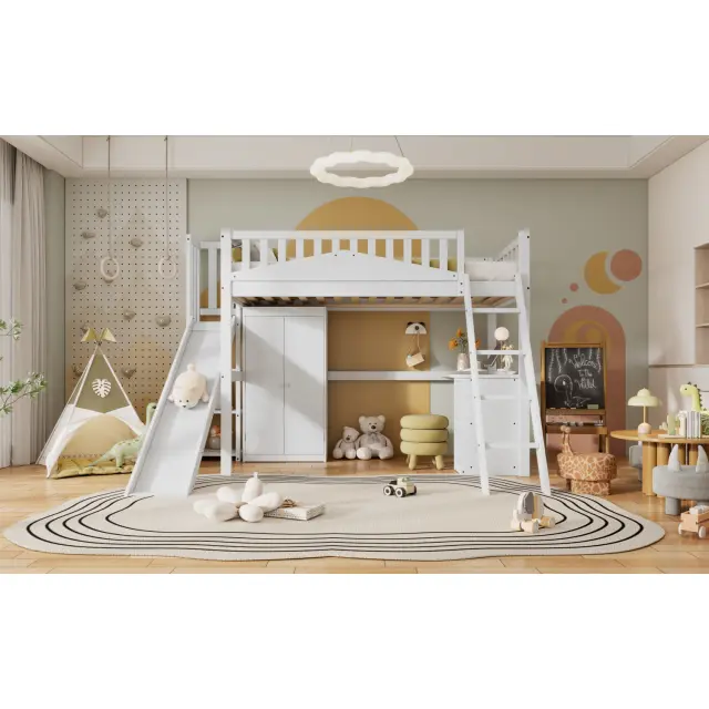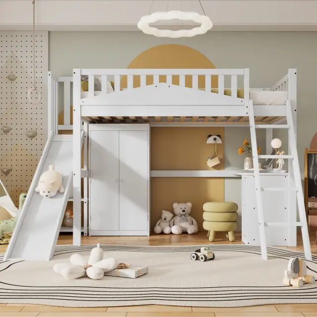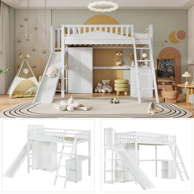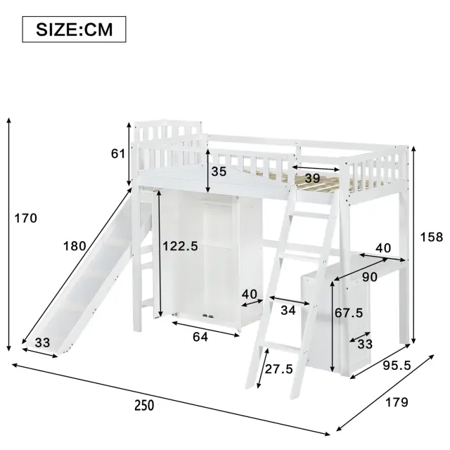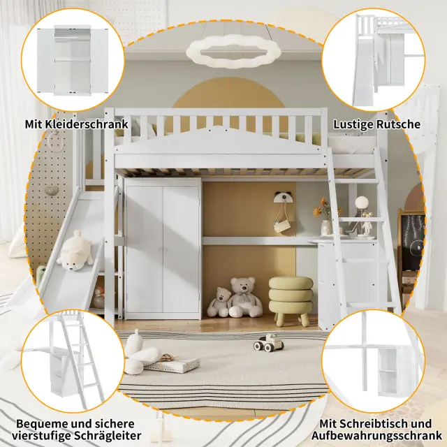 Pogradna postelja z mizo, omaro in varnostno ograjo, bor/MDF, bela, 90x200 cm