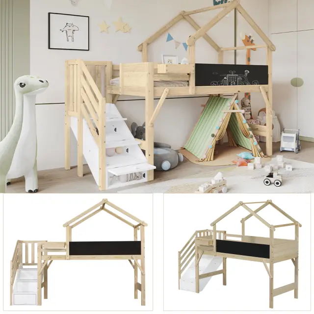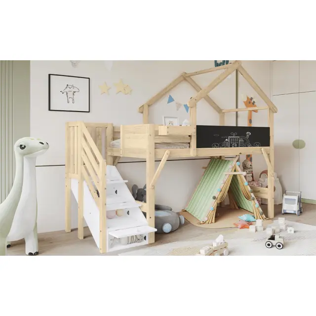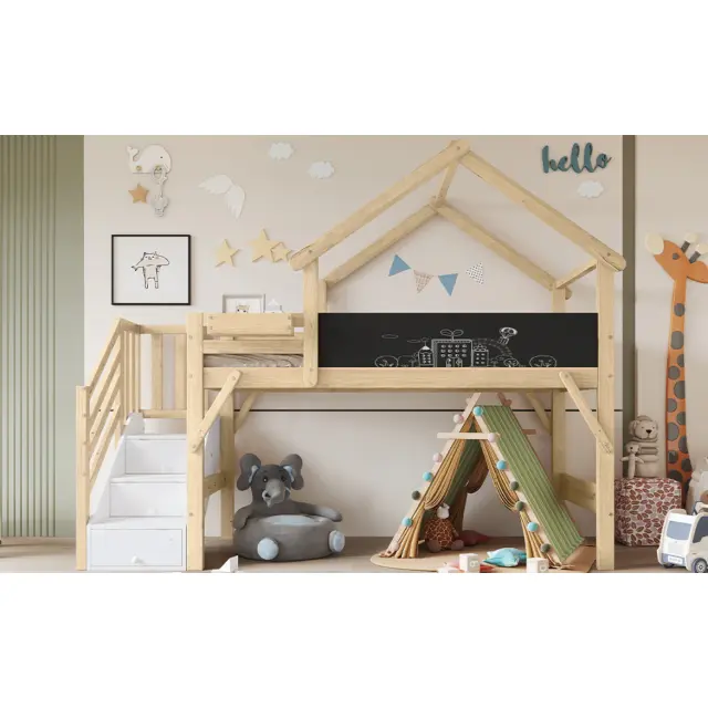 Pogradna postelja z motivom strehe, pobarvano tablo in 3 omaricami, 90x200 cm