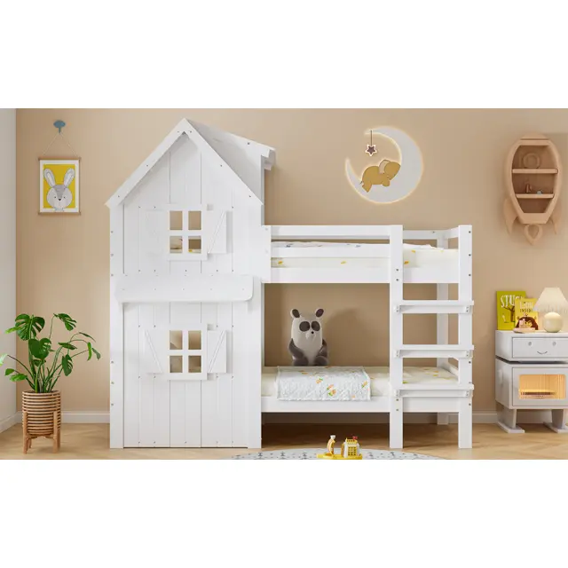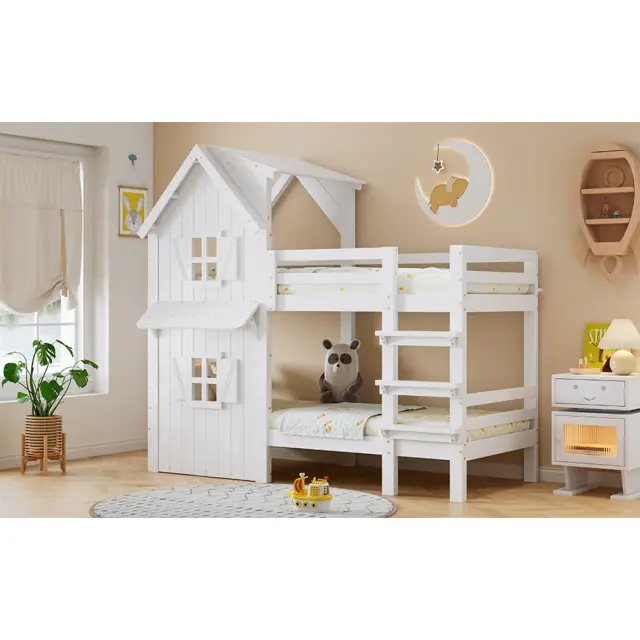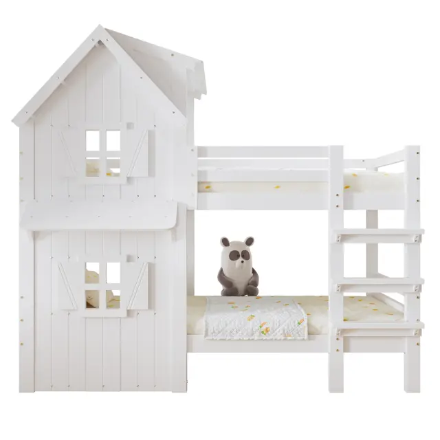 Pogradna postelja z okni, varnostna ograja, lestev, bor, bela, 90x200 cm